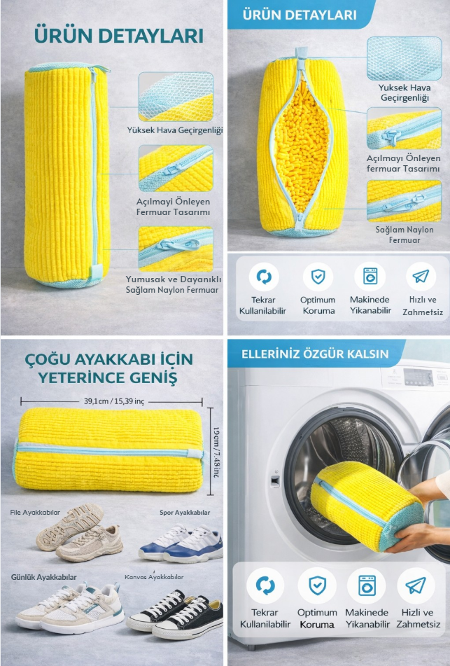 Ayakkabı yıkama torbası çok hızlı geldi hemen denemek istedim. Bir çift spor ayakkabım çok rahatlıkla sığıyor içine çamaşır suyu içermeyen sıvı deterjan ekleyerek yarım saatlik programla yıkadım. Çok başarılı bir ürün spor ayakkabım tertemiz oldu ürünü çok sevdim.